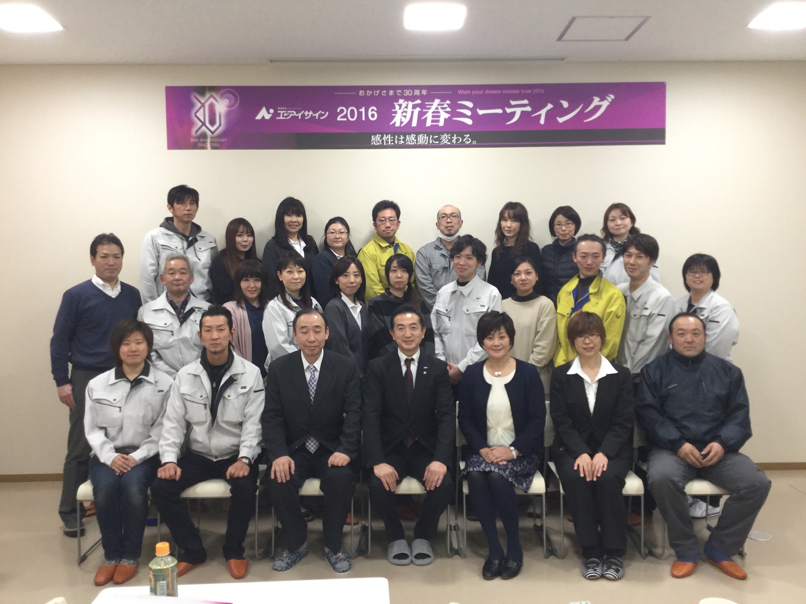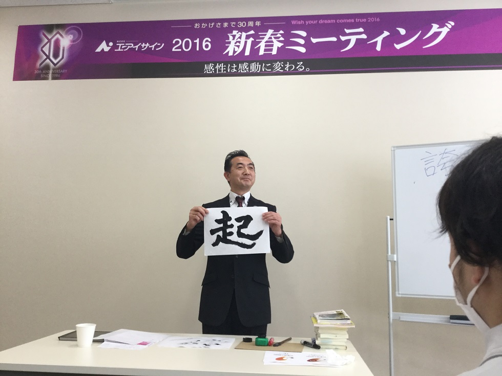 2016新春ミーティング スタッフブログ - 2016.02.15 遅くなりましたが、1月9日(土) 今年の新春ミーティングが行われました。 今年のスローガンは “起”!!30周年を迎え、新たなる出発!! 皆で気持ちを込めて仕事をしてまいります。本年もどうぞよろしくお願いいたします! 株式会社エーアイサイン 一同 投稿ナビゲーション 前へ2015年度新入社員次へバレンタインデー